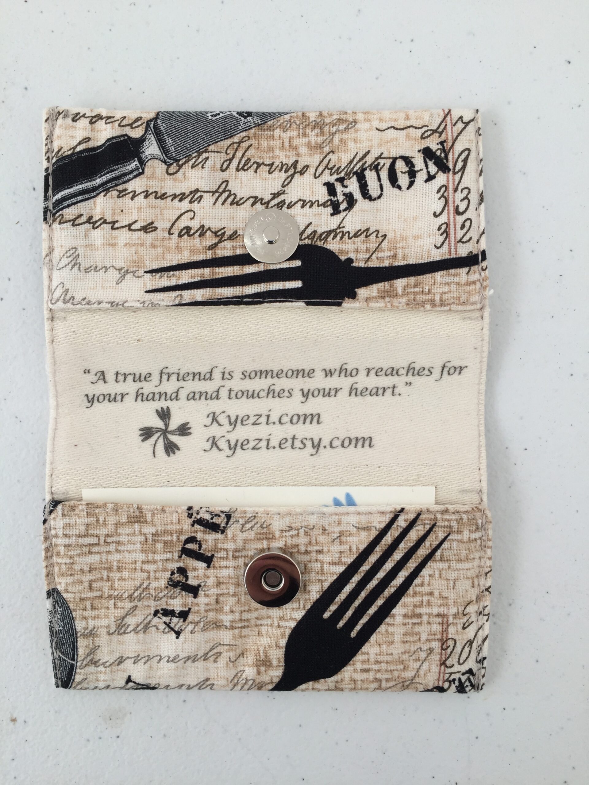 Made with cotton fabric in a variety of cute prints, this wallet has 2 pockets, one on each side to hold 5-6 cards each! It can hold a good amount of business cards and cash on each pocket.
