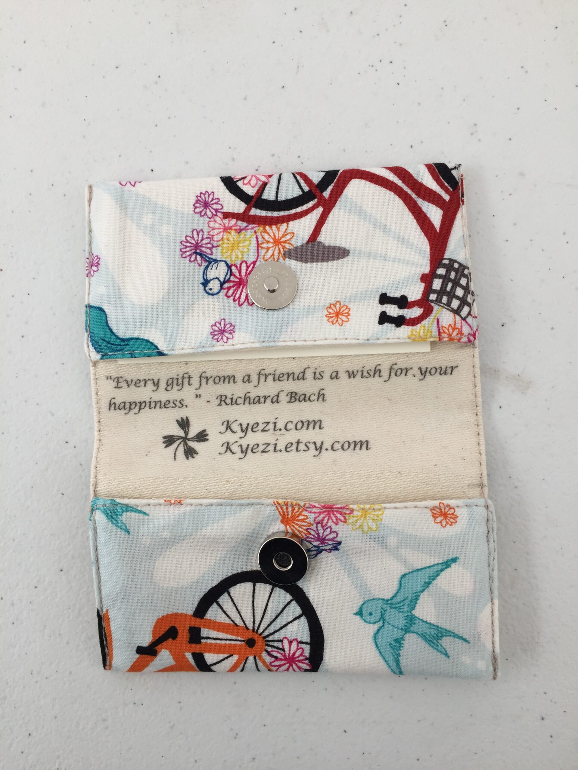 Blue, Orange and Pink Bicycle and Bird Print Mini Wallet, Credit Card Wallet, Business Card Holder